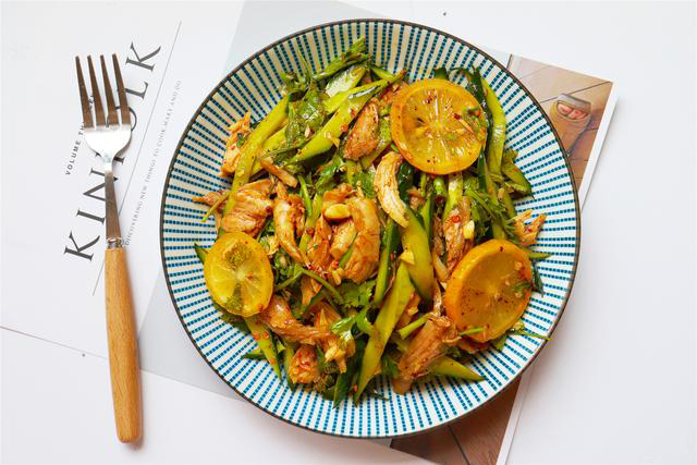 ?雞腿冷水下鍋,加一勺料酒、三片姜,小火煮開,撇去浮沫。 ?水開煮十分鐘,撈出晾涼,撕成條狀,有條件可以用冰水浸一下。 ?黃瓜清洗干凈切成小條,加檸檬片、香菜、蒜末、3勺生抽、2勺醋、1勺蠔油、1勺辣椒油,攪拌均勻。