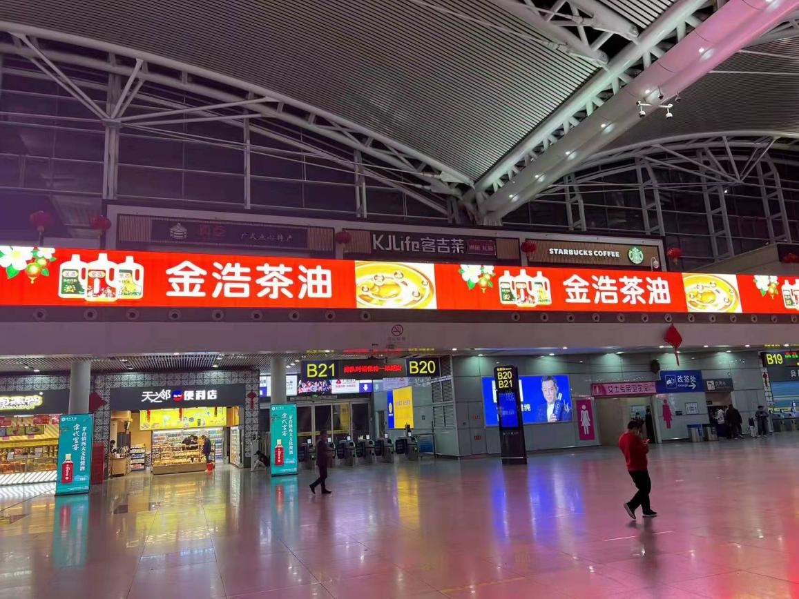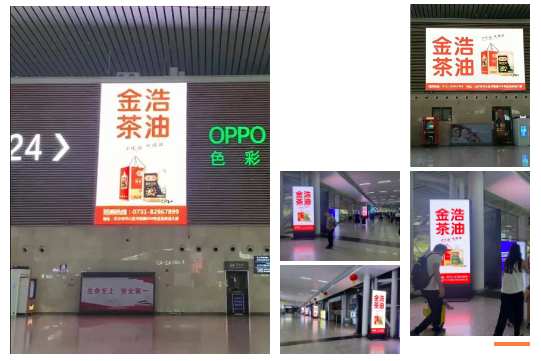 金浩茶油以具備強大聚客效應和場景共情特征的高鐵車站為核心,先后在長沙高鐵南站、廣州高鐵南站、深圳高鐵北站上刊多種媒體。超百米環屏廣告,霸氣“種草”,直擊目標消費者,成為商旅人群進站、取票、候車、購物、休息等各個環節不可忽視的視覺焦點;LED大、小屏廣告,震撼吸睛,進一步完善并強化目標消費者的關注點攔截。