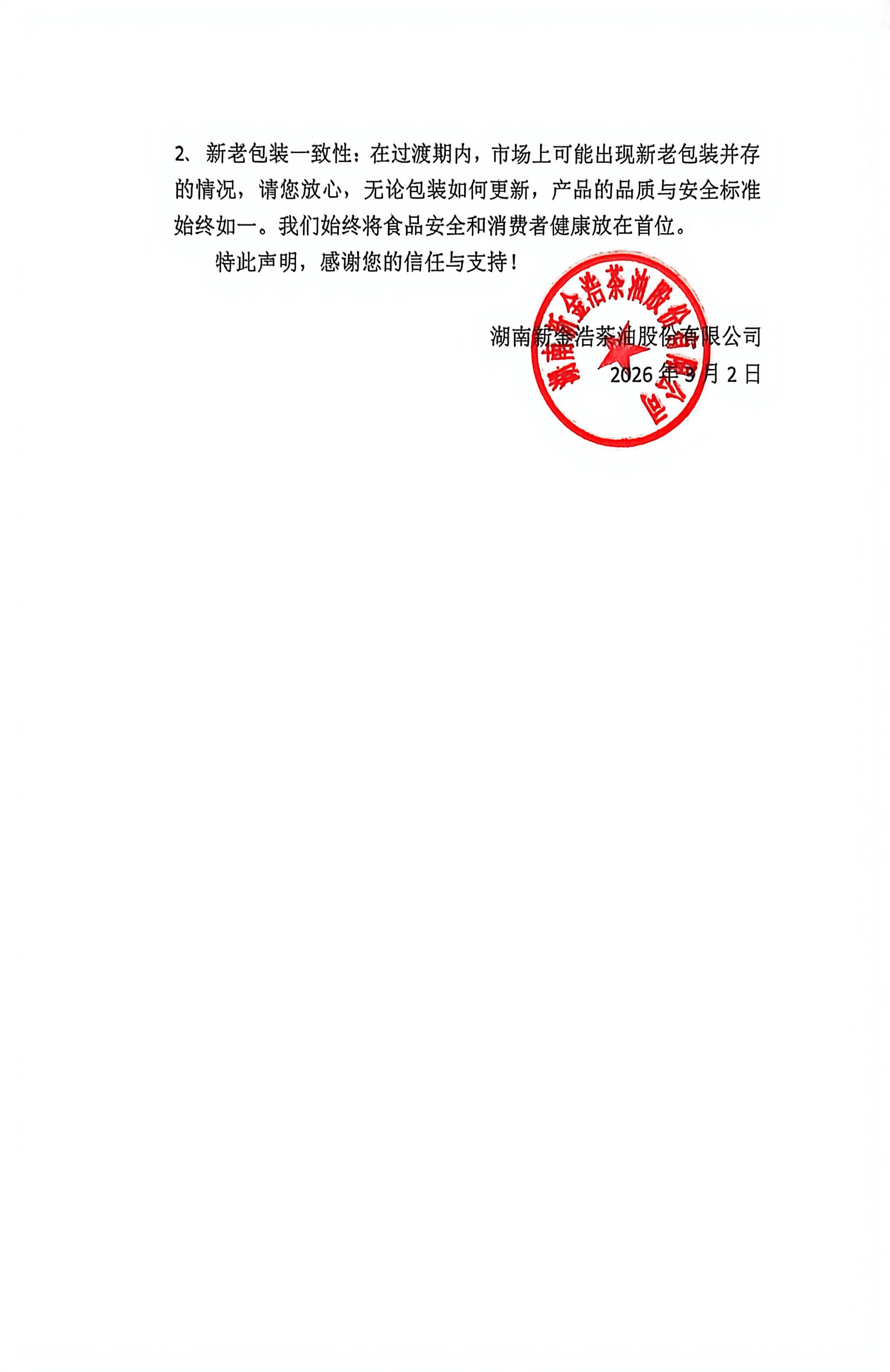 金浩茶油關于提前實施食品安全國家標準及規章