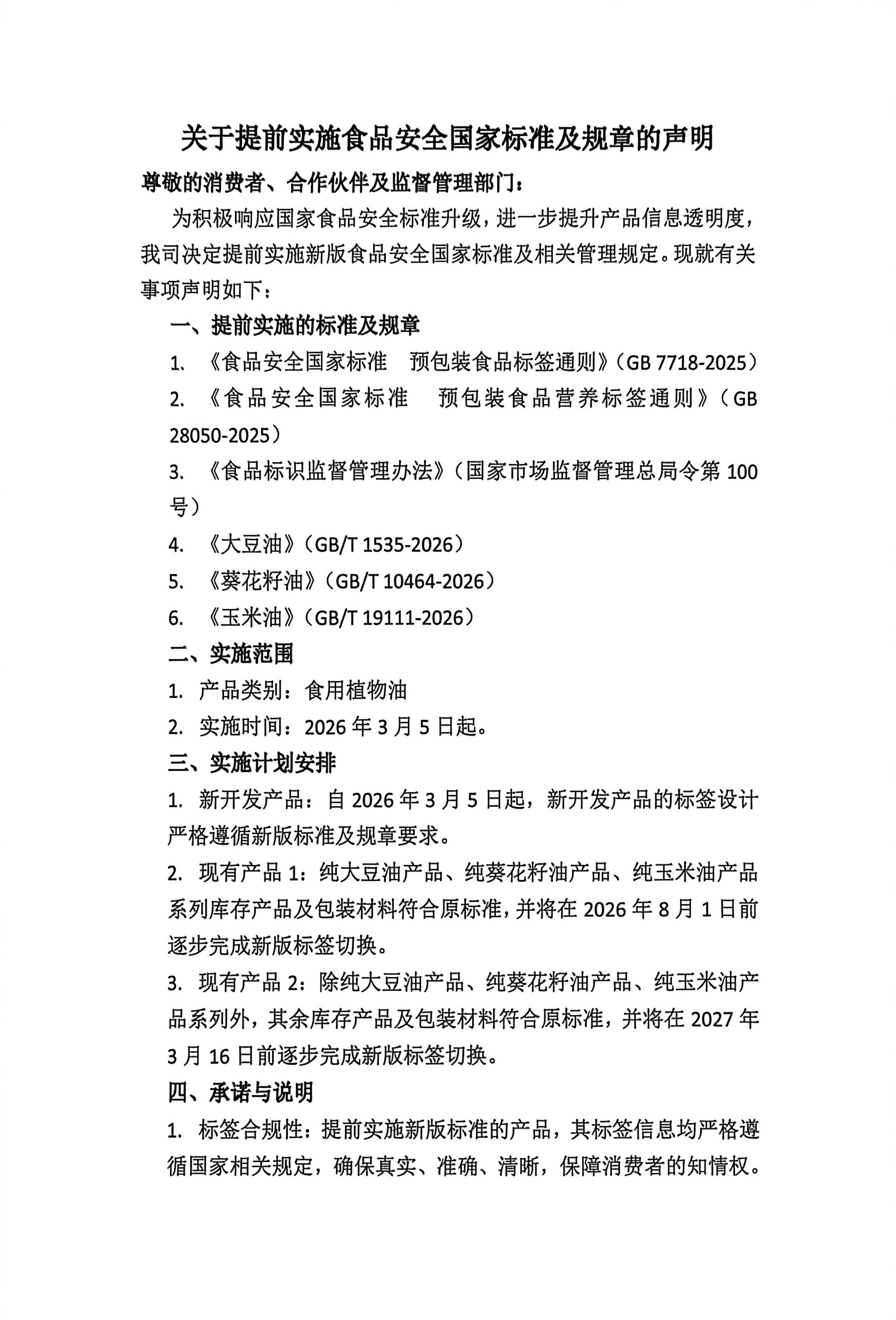 金浩糧油關于提前實施食品安全國家標準及規章